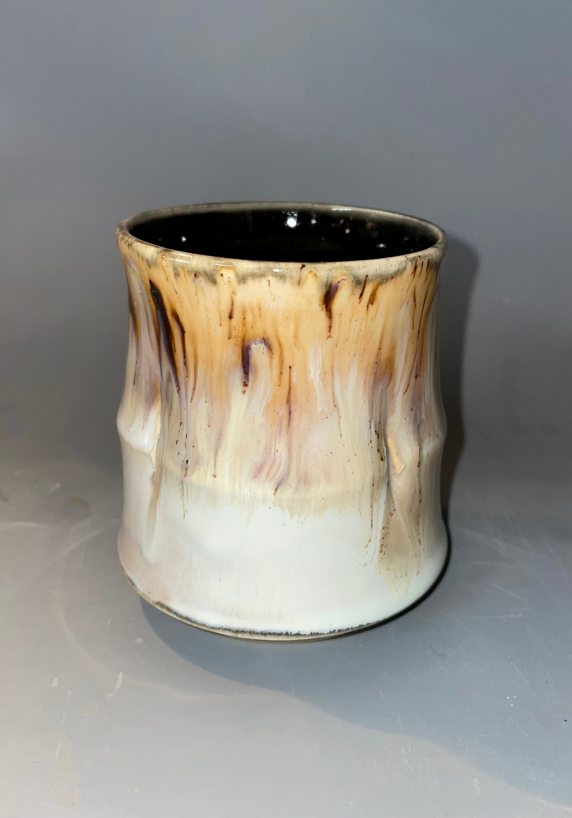 These mugs have streaks of color with a light outside and dark inside.